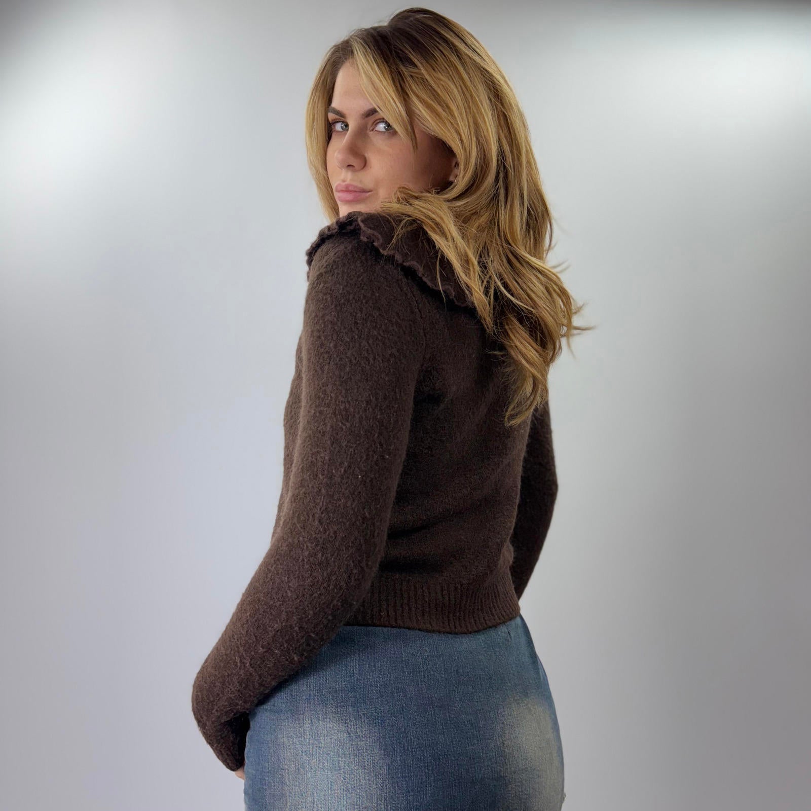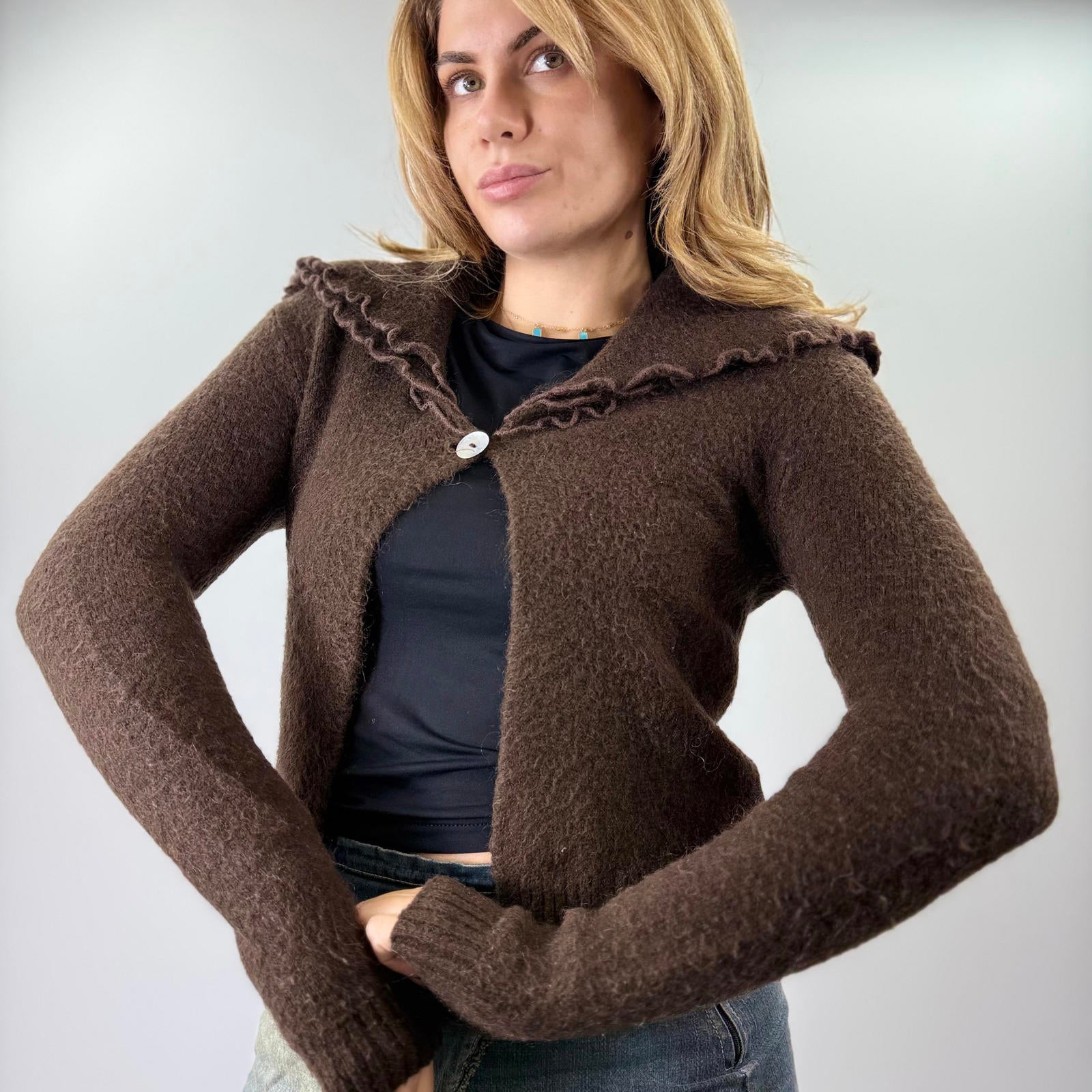 Angels Brown Knit Cardigan Sweater with Ruffle Collar- SIZE M