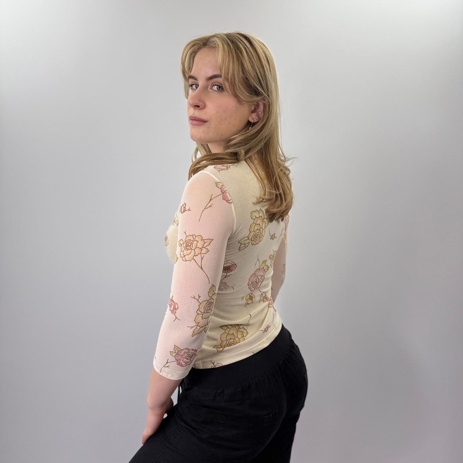 B Floral Print Sheer Mesh Top with 3/4 Sleeves- SIZE XS