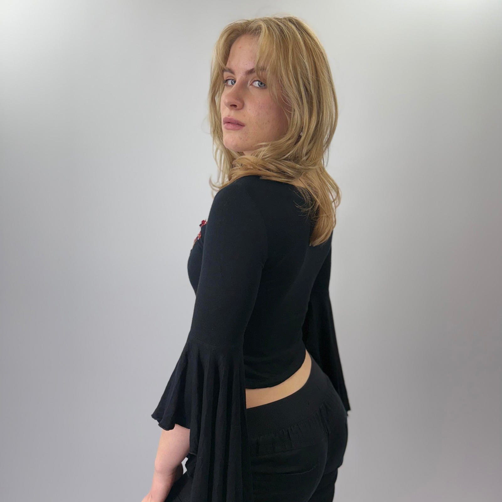 Black Long Sleeve Top with Floral Embellishment- SIZE XS