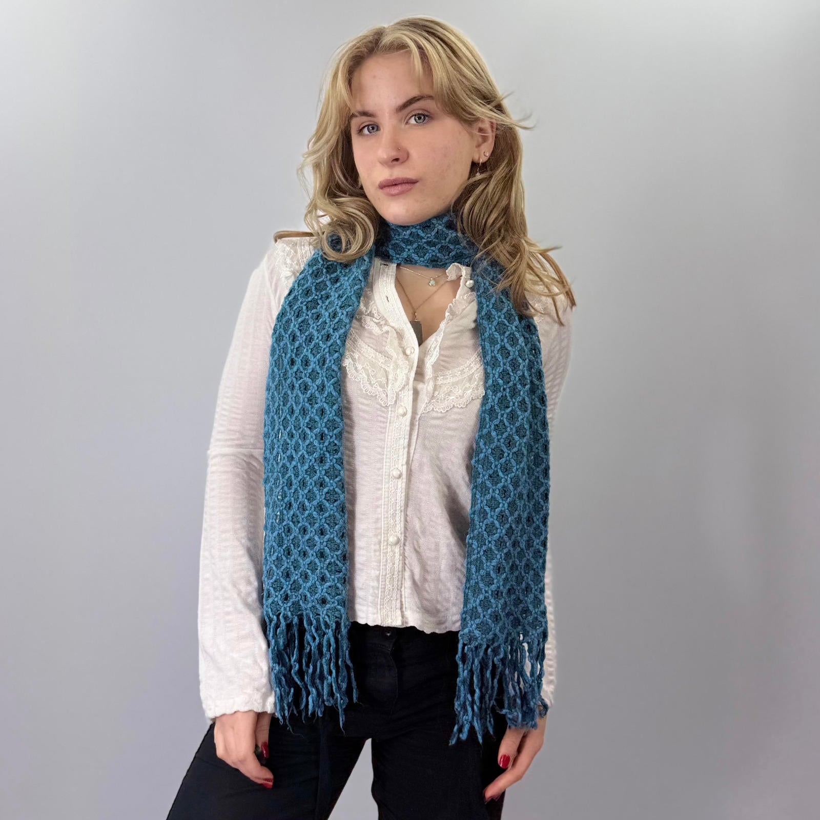 Blue Textured Knit Scarf with Fringe