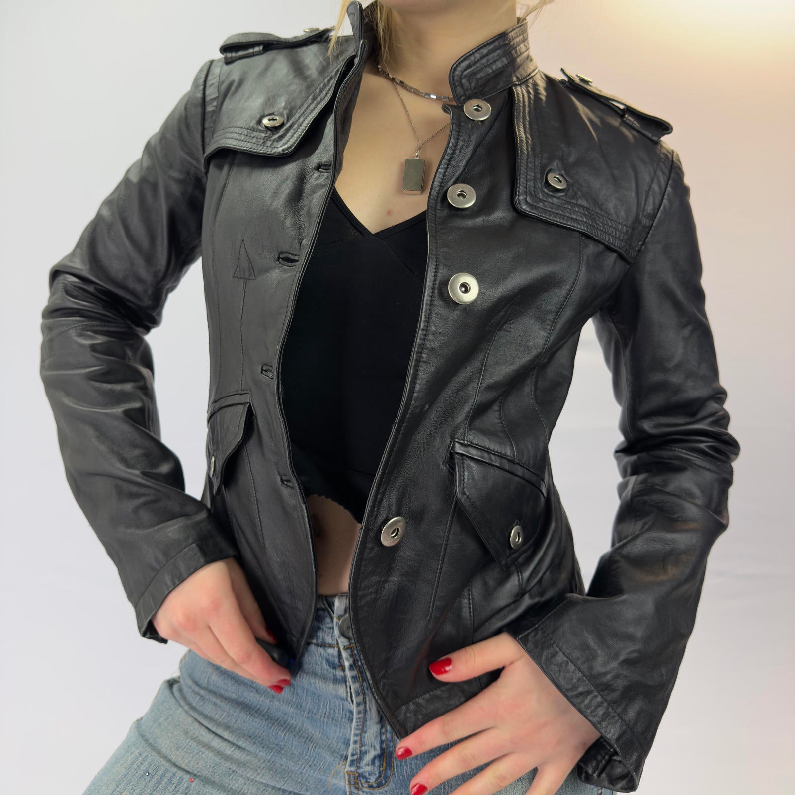Conbipel Black Leather Jacket with Button Details- SIZE XS