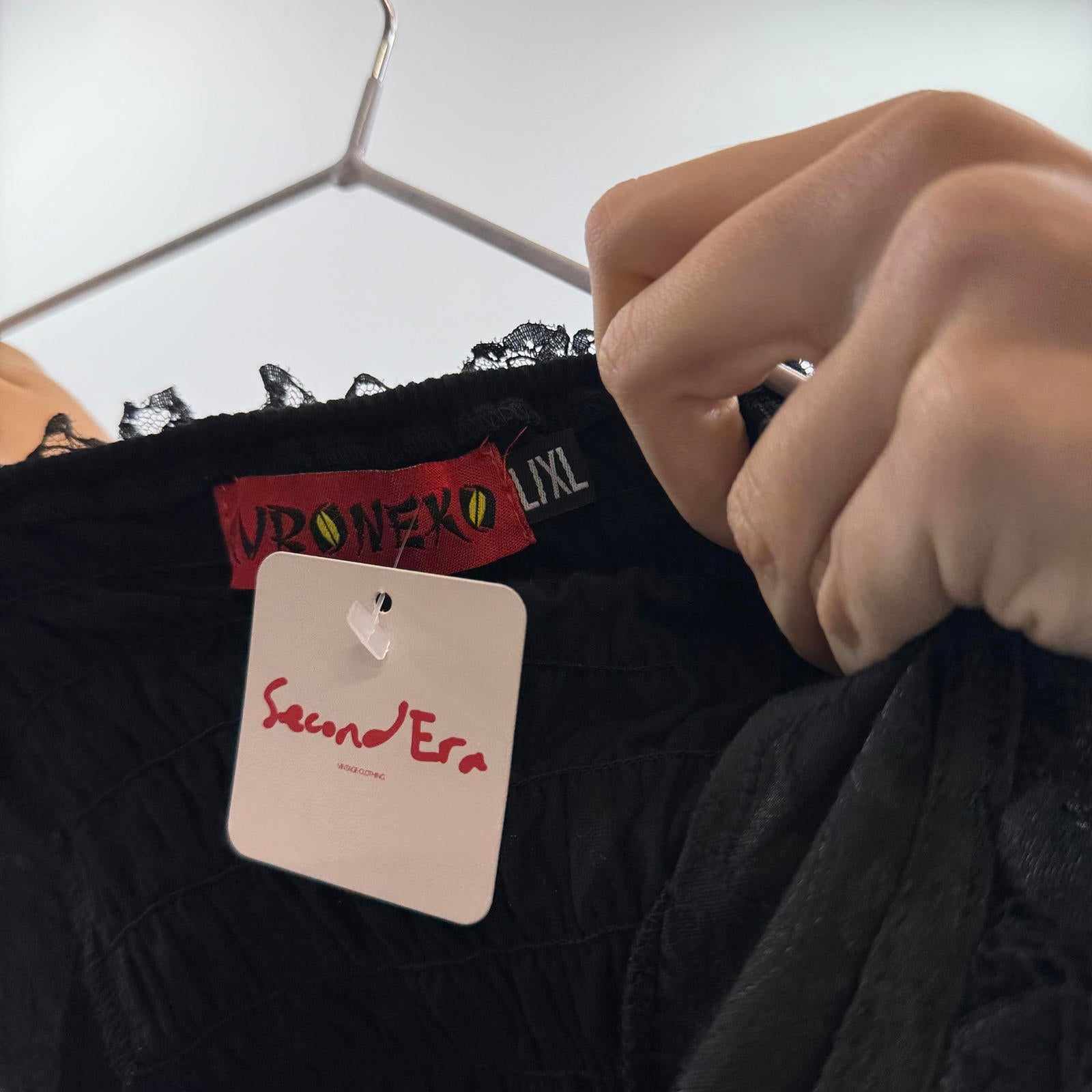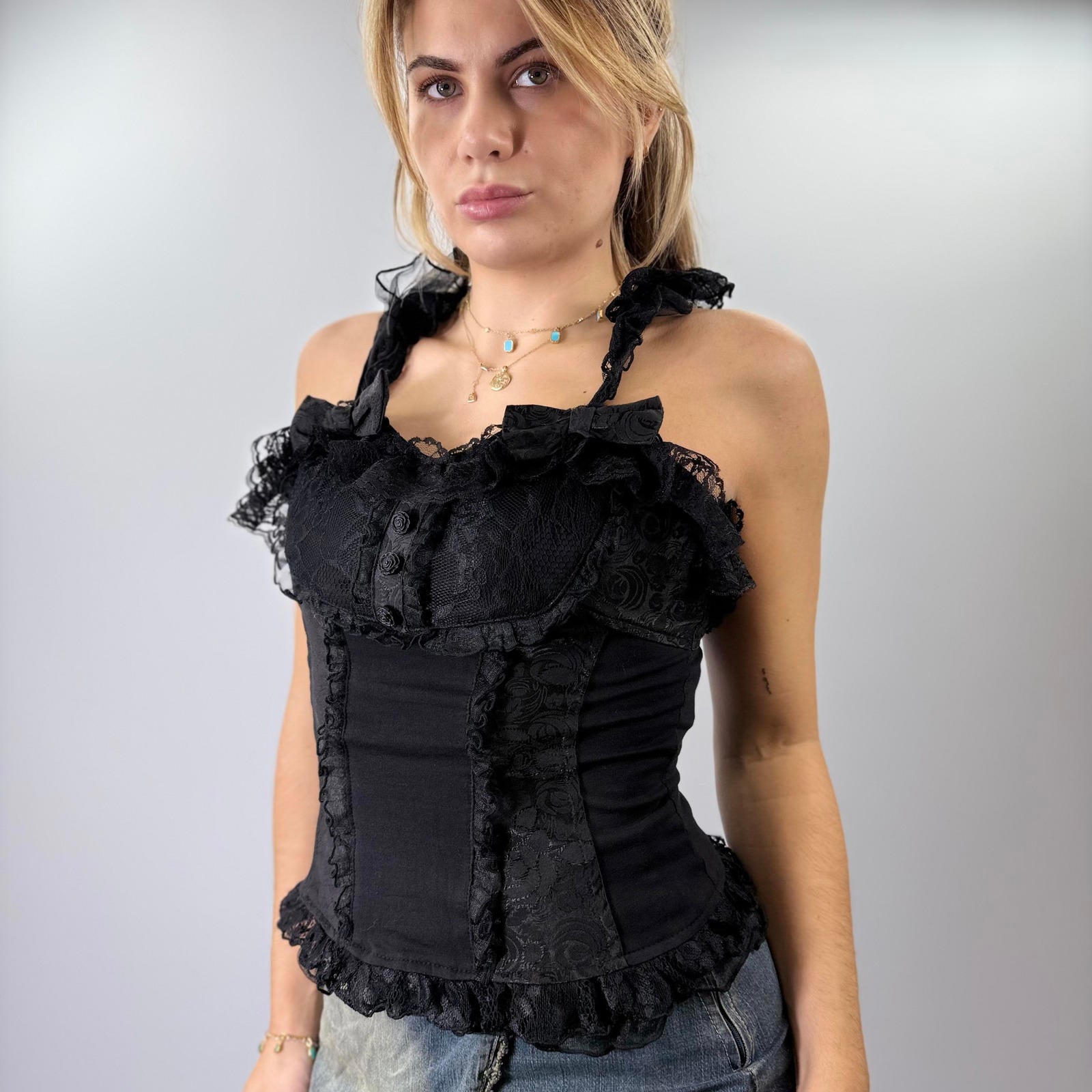 Kuronex black corset top featuring lace detailing and ruffled edges.