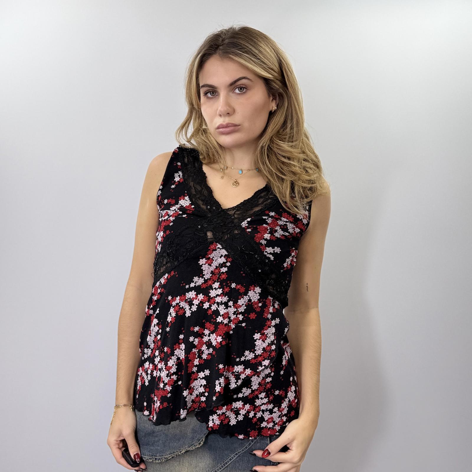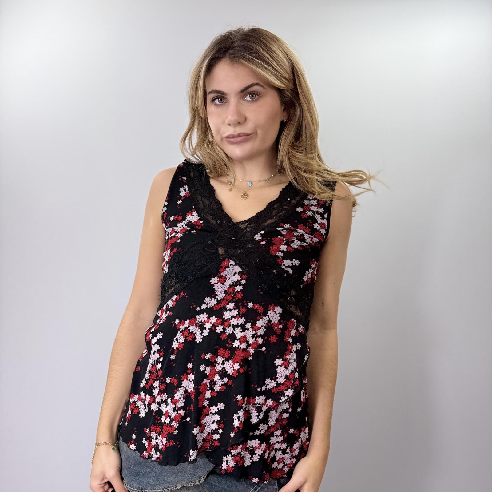 Max- w black sleeveless camisole top featuring a red and white floral print.