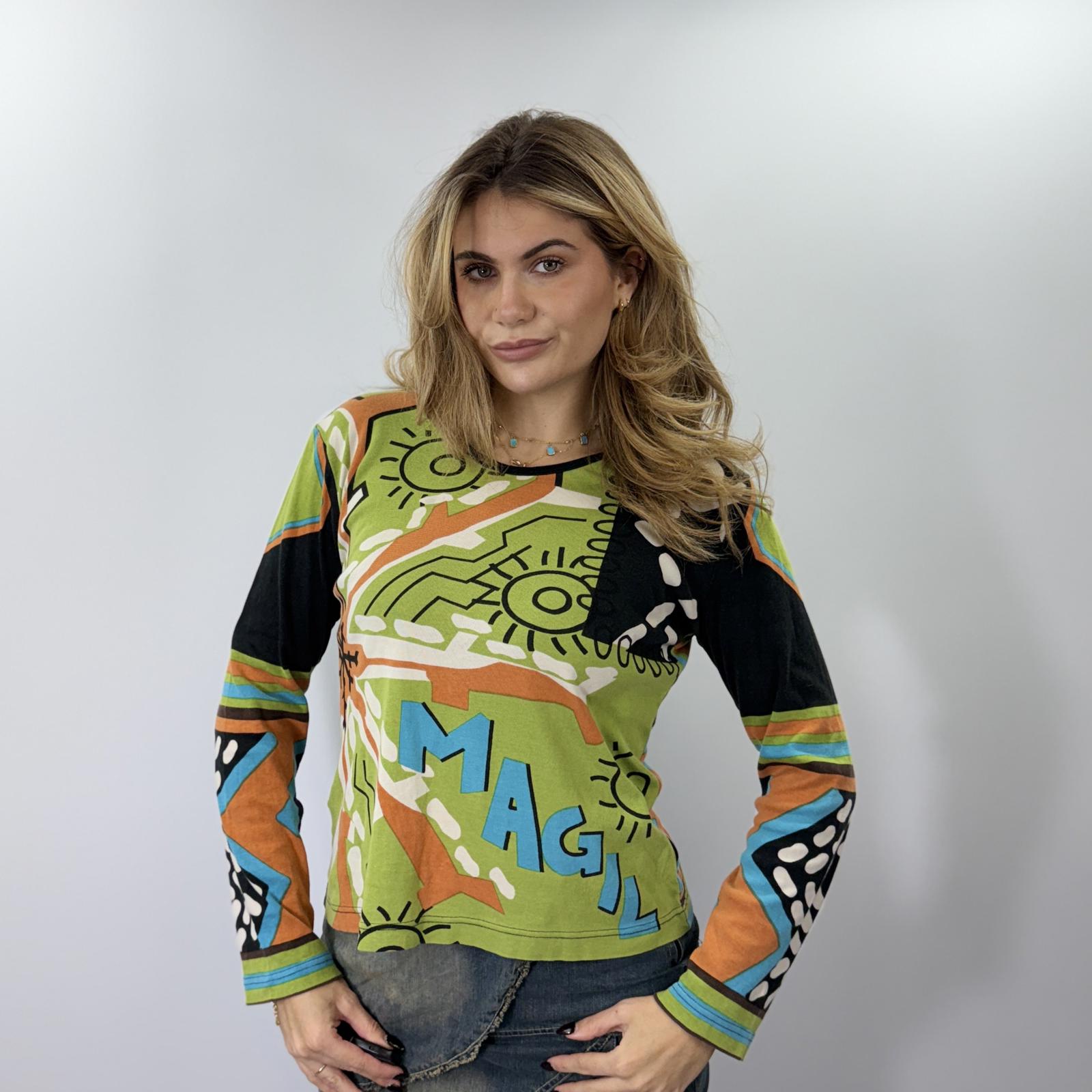 No Sweat colourful long sleeve top featuring an abstract, vibrant print in green, orange, blue, black and cream.
