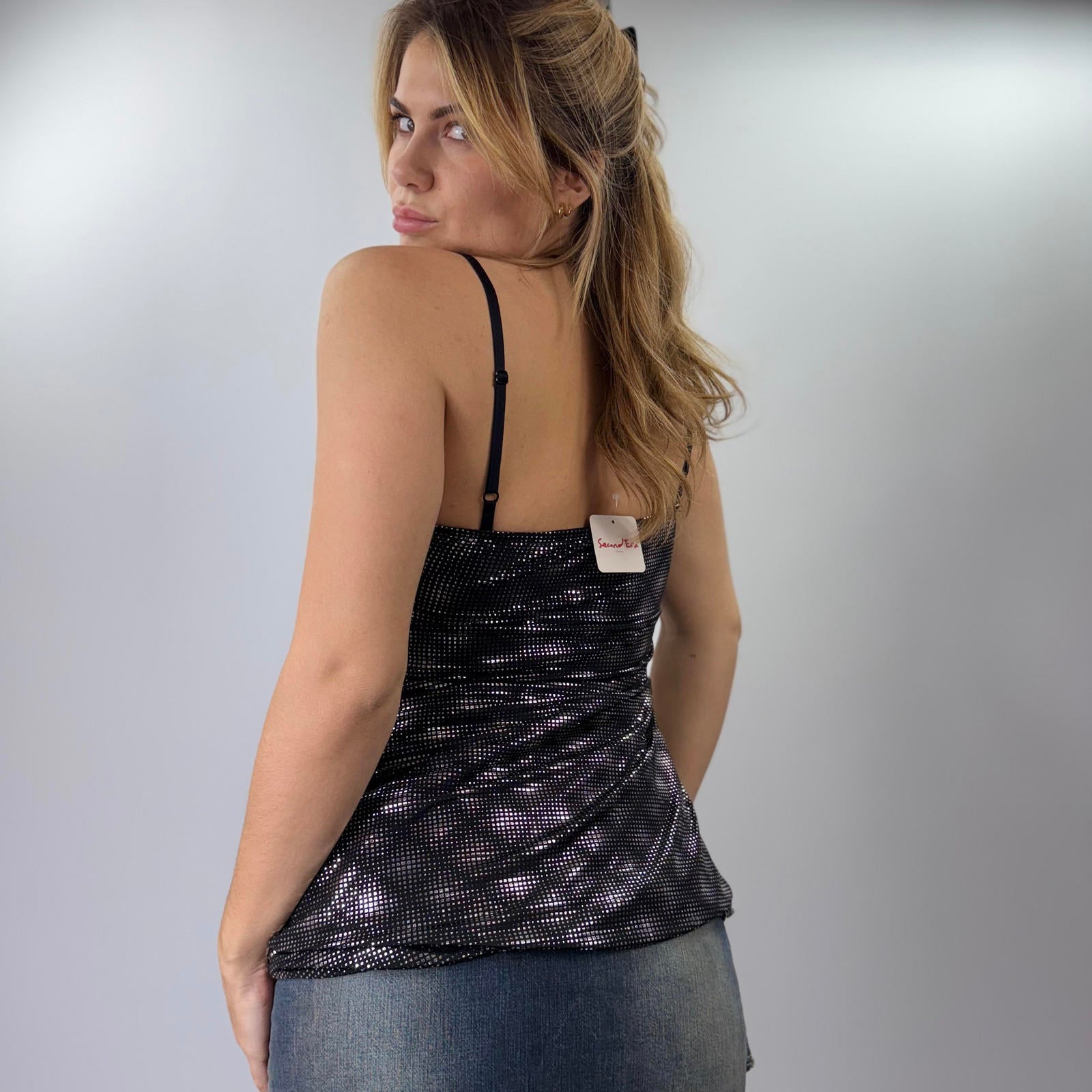 Ske Italian black spaghetti strap tank top with a shimmering, textured fabric.