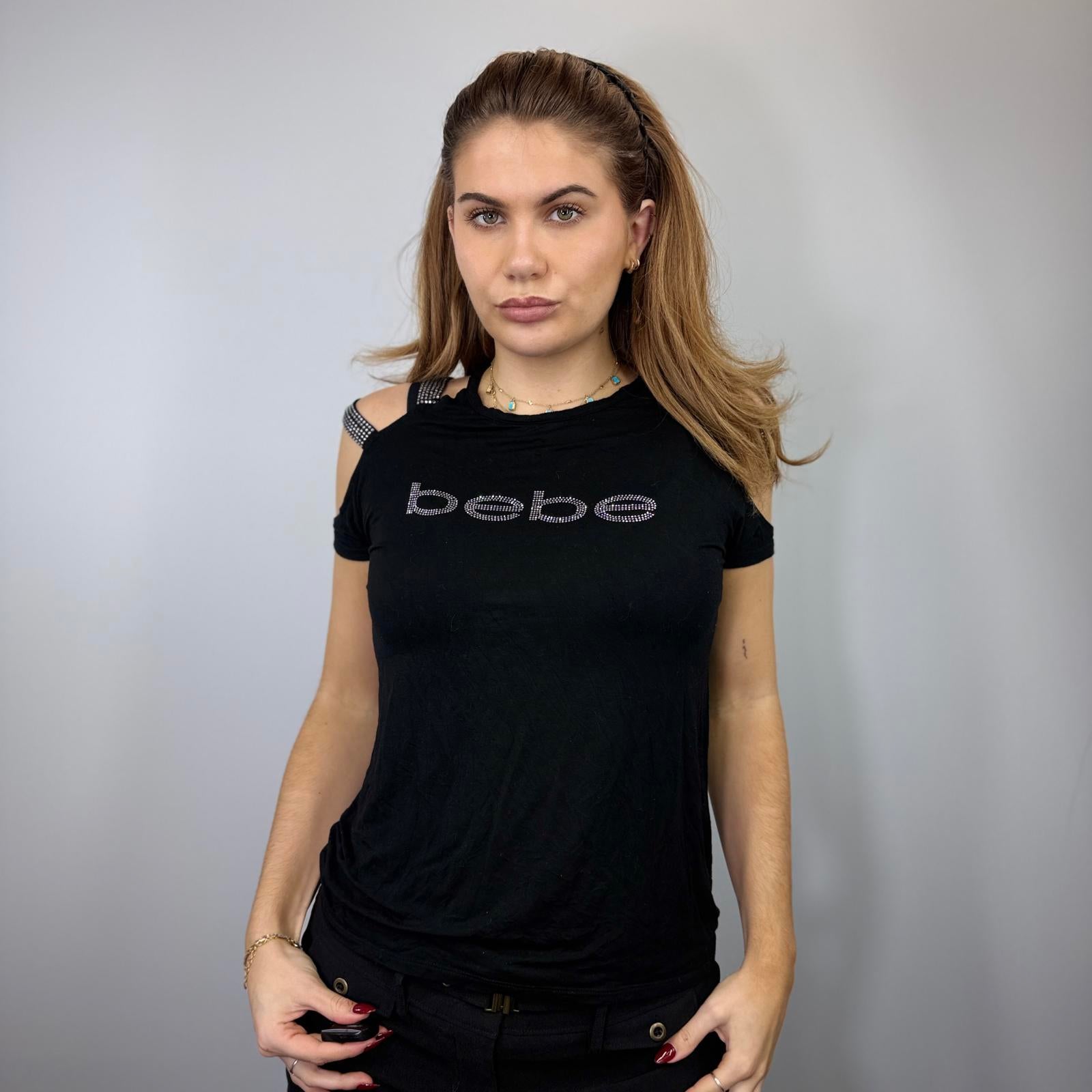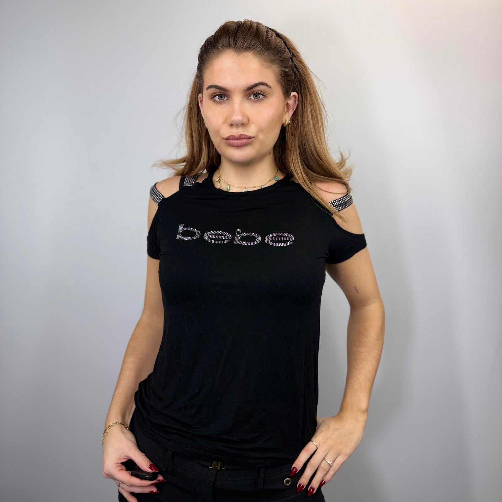 Iconic Y2K black Bebe cold shoulder top featuring rhinestone logo detailing across the front and embellished strap accents. Soft stretch fabric with a flattering fitted silhouette, giving ultimate early 2000s glam vibes. Perfect for pairing with low-rise jeans, mini skirts or heels for that true 00s going-out look. A must-have vintage statement piece for any Y2K wardrobe. Please note the material is a little worn still life left.